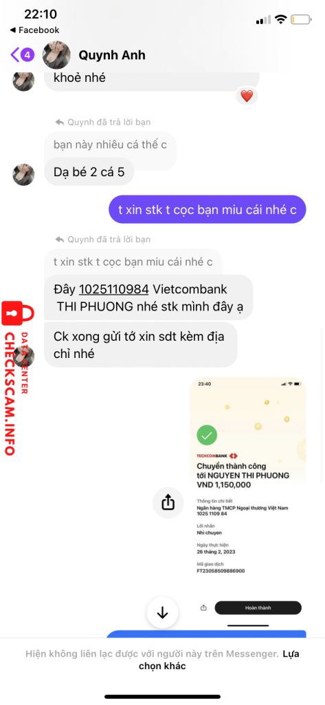 Scammer Alert: NGUYEN THI PHUONG Reported: November 16, 2024 Scammer Information Full Name: NGUYEN THI PHUONG Payment Gate: Vietcombank Payment Account: 1025110984 Category: Marketplace scams Source: Checkscam Evidence Files Report Description Bạn này bán mèo lừa cọc xong block. Comments Your comment Add Comment No comments yet. Be the first to share your experience with this scammer.