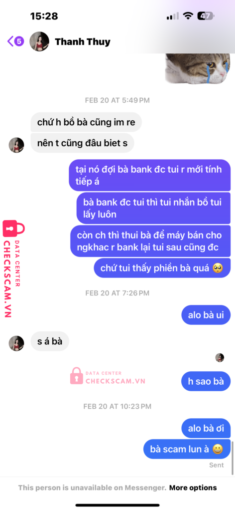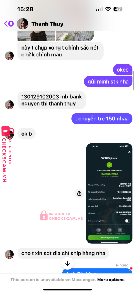 Scam tiền mua máy ảnh. Cọc trước 150 rồi bắt gửi thêm 150 nữa với lý do là viettel post chỉ nhận cod dưới 500. mình nghi ngờ nên lên fb check lại thì mới biết bị phốt. xong mới giả bộ nhắn tạo tình huống giả để nó trả tiền cọc nhưng ko được xong ăn block luôn