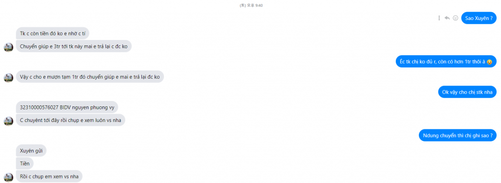Scammer Alert: nguyen thi thanh thuy Reported: November 16, 2024 Scammer Information Full Name: nguyen thi thanh thuy Payment Gate: BIDV Payment Account: 32110001302346 Category: Marketplace scams Source: Checkscam Evidence Files Report Description Hack FB của bạn mình rồi gửi mess kêu chuyển tiền vì đang cần tiền gấp Comments Your comment Add Comment No comments yet. Be the first to share your experience with this scammer.