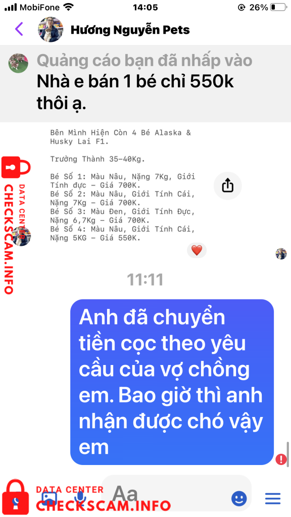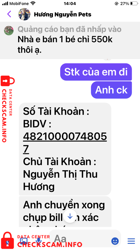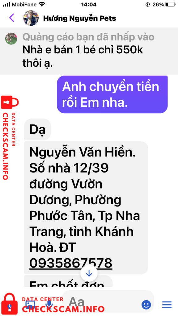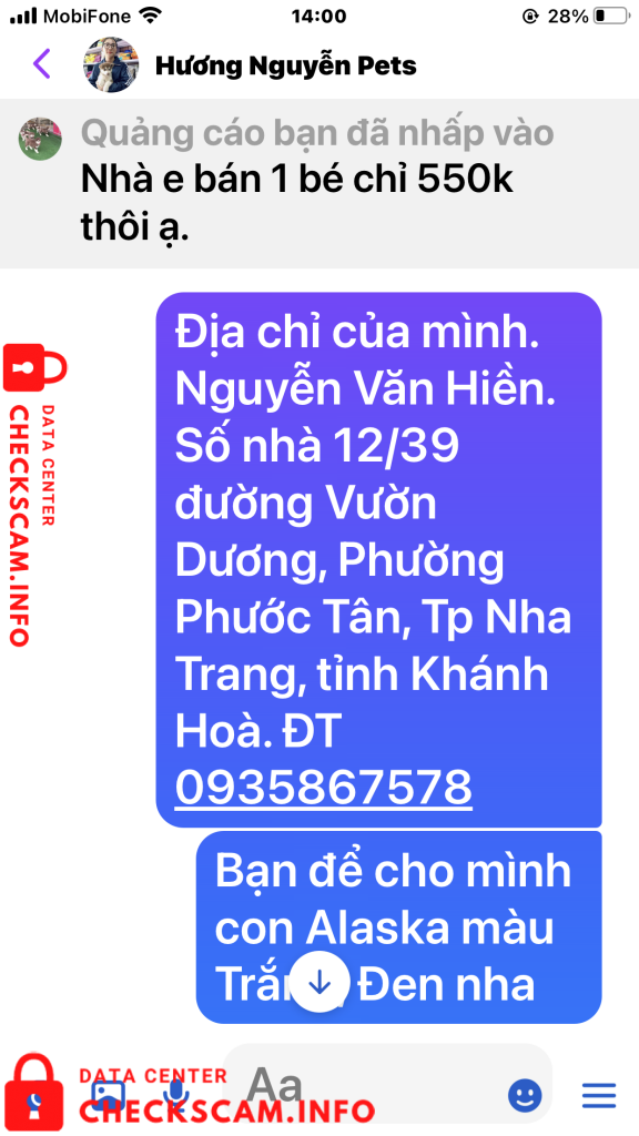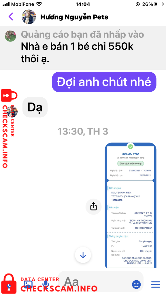 Tôi tên: Nguyễn Văn Hiền. Địa chỉ thường trú 12/39 đường Vườn Dương. phường Phước Tân, Tp Nha Trang, tỉnh Khánh Hòa. Điện thoại số 0935867578. Tôi tố cáo Vợ chồng chị có tên tài khoản là Hương Nguyễn Pets đã đăng tin lừa đảo chiếm đoạt tài sản của người khác bằng hình thức đăng hình ảnh video clip bán chó Alaska giống trên mạng xã hội facebook. Hình thức lừa đảo của cặp vợ chồng chi Hương như sau: Chị hương đăng tin và hình ảnh video chó Alaska và Hucky Lai F1 giống lên mạng Xã Hội bán với giá từ 550k- 700k/1con tùy loại. Sau khi thương lượng với tôi xong chị yêu cầu tôi chuyển tiền đặt cọc trước 50% giá trị chú Chó đã thỏa thuận bằng số tiền là 350K. Số tiền còn lại 50 % Tôi sẽ phải thanh toán nốt cùng với tiền cước phí vận chuyển và chăm sóc chó trong lúc vận chuyển sau khi nhận được Chó. Tôi đã tin tưởng và chốt đơn hàng, chuyển tiền cho vợ chồng chị Hương vào tài khoản tại ngân hàng BIDV – NH TMCP ĐẦU TU VÀ PHÁT TRIỂN VN. Số tài khoản 48210000748057 lúc 13h, 29 phút, 58 giây ngày 21/09/2021 Từ tài khoản số 117089989 Ngân Hàng Á Châu (ACB) Tên tài khoản là Nguyễn Văn Hiền. Số tiền 350k.