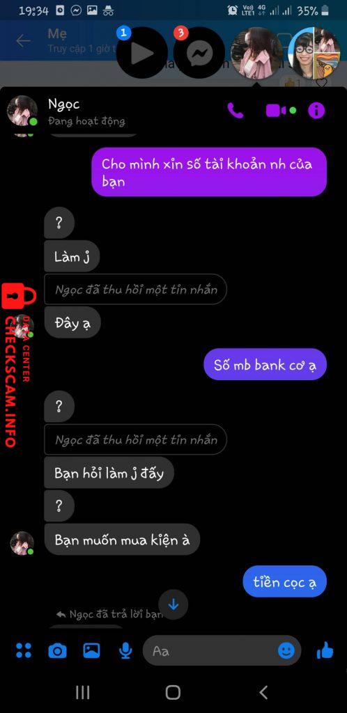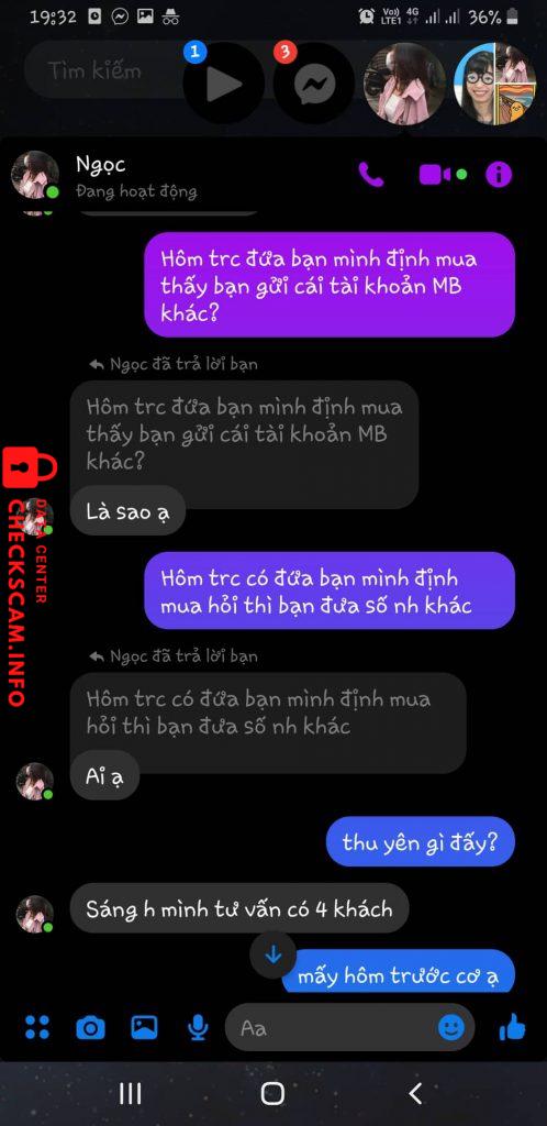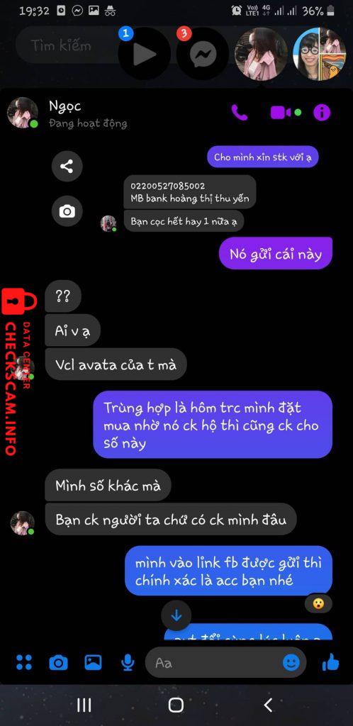 Cùng một đối tượng lừa đảo bán thanh lý hàng bom có stk 02200527085002 MB bank hoàng thị thu yến hôm trước. Hôm nay đổi acc khác hỏi mua lại thì đã đưa 2 số tk mới nhưng nhanh chóng thu hồi. Sau khi bị nghi ngờ do stk không cùng tên họ thì lấy lý do là dùng tk chị gái và có gửi CMND (loại cũ, không phải CCCD) nhưng cũng thu hồi ngay lập tức.