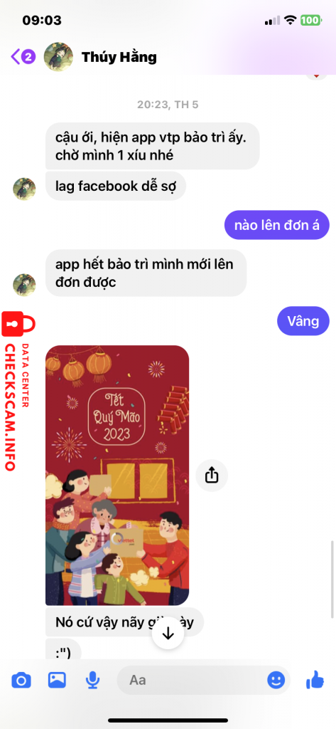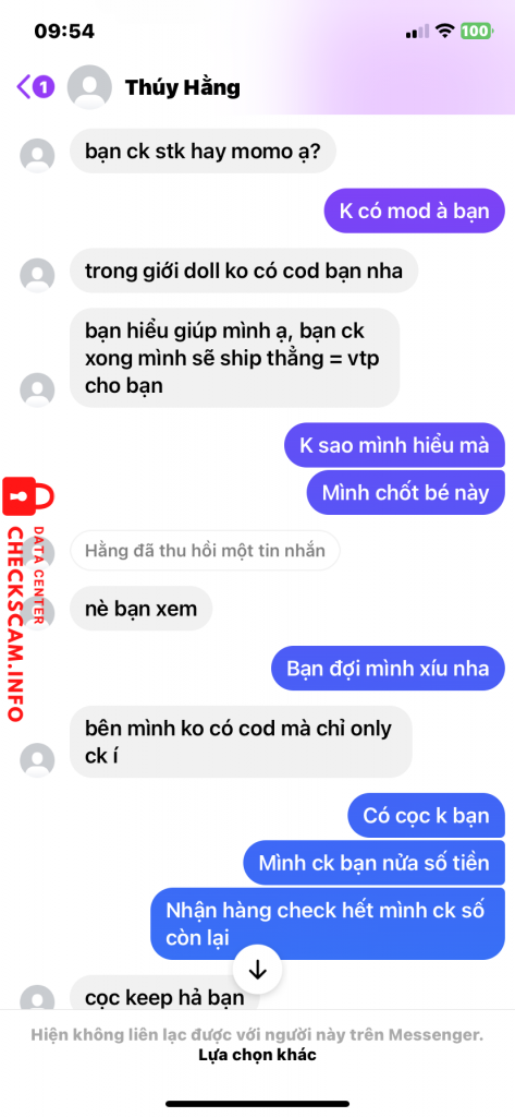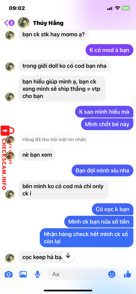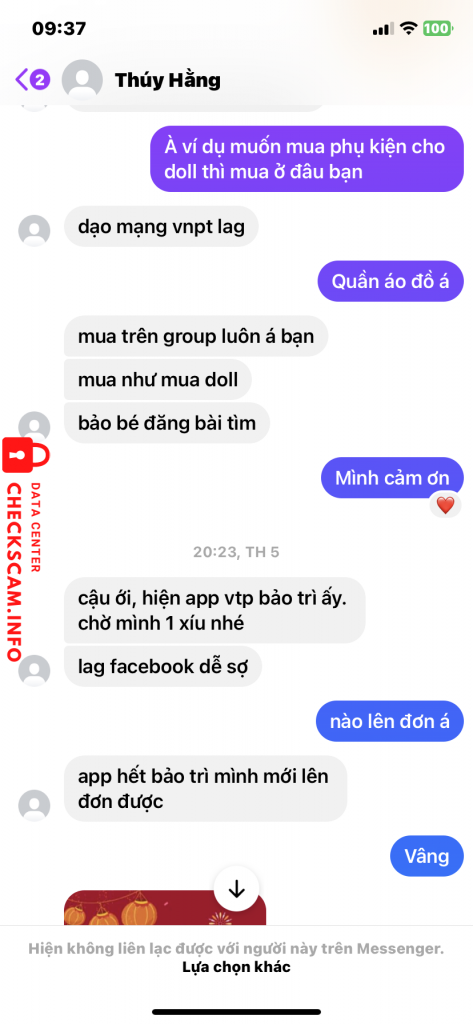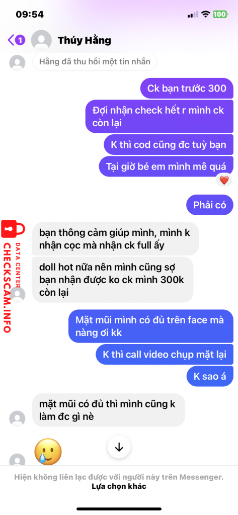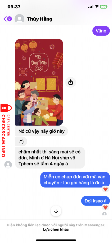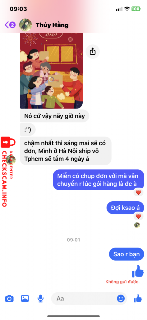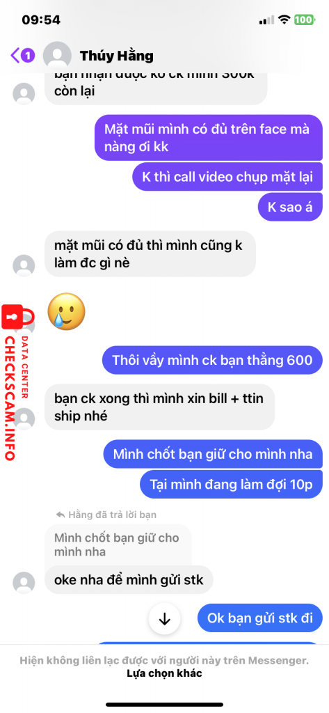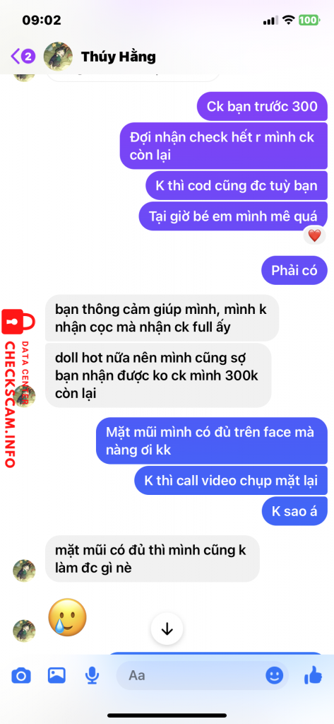 Scammer Alert: nguyen thi thu thuy Reported: November 16, 2024 Scammer Information Full Name: nguyen thi thu thuy Payment Gate: Agribank Payment Account: 5406205321276 Category: Marketplace scams Source: Checkscam Evidence Files Report Description Lừa đảo buôn bán, rồi khoá nick Comments Your comment Add Comment No comments yet. Be the first to share your experience with this scammer.