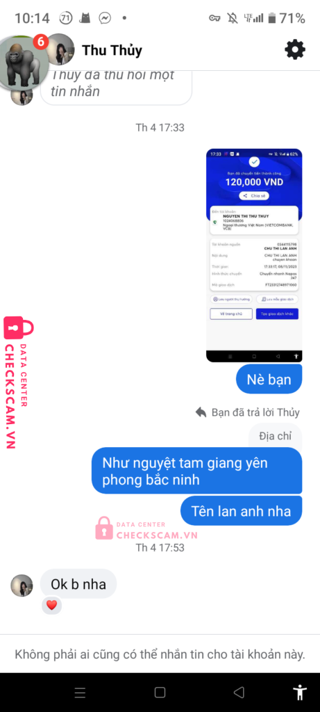 Scammer Alert: Nguyễn Thị Thu Thủy Reported: November 16, 2024 Scammer Information Full Name: Nguyễn Thị Thu Thủy Payment Gate: Vietcombank Payment Account: 1024068806 Category: Marketplace scams Source: Checkscam Evidence Files Report Description Nhỏ này ở thcs phong khê nha Comments Your comment Add Comment No comments yet. Be the first to share your experience with this scammer.