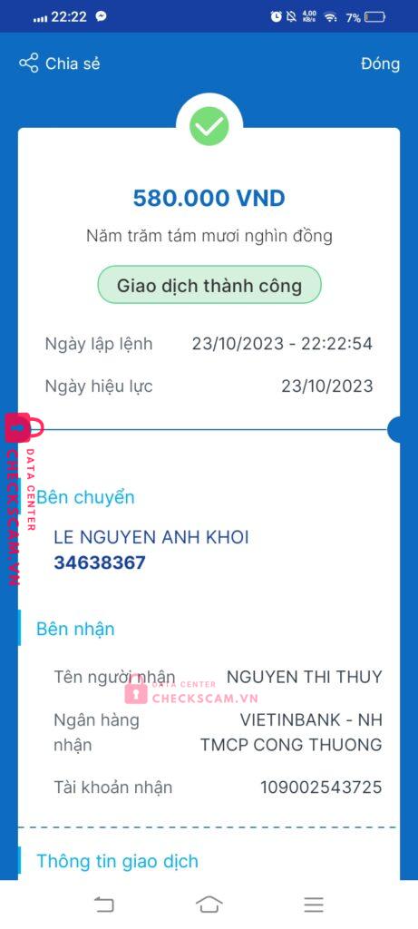 Scammer Alert: Nguyen thi thuy Reported: November 16, 2024 Scammer Information Full Name: Nguyen thi thuy Payment Gate: Viettinbank Payment Account: 109002543725 Category: Marketplace scams Source: Checkscam Evidence Files Report Description Tạo dựng lòng tin rồi scam Comments Your comment Add Comment No comments yet. Be the first to share your experience with this scammer.