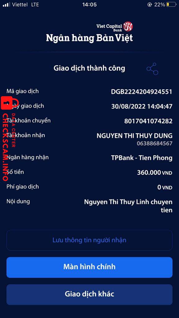 Scammer Alert: Nguyễn Thị Thuỳ Dung Reported: November 16, 2024 Scammer Information Full Name: Nguyễn Thị Thuỳ Dung Payment Gate: TP Bank Payment Account: 06388684567 Category: Marketplace scams Source: Checkscam Evidence Files Report Description Chuyển khoản nhận mở tài khoản ck xong bị xoá, bị tố rất nhiều trên group CTV mở tài khoản onl Comments Your comment Add Comment No comments yet. Be the first to share your experience with this scammer.