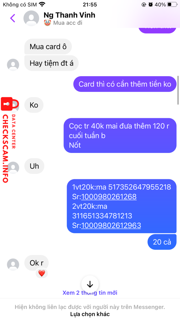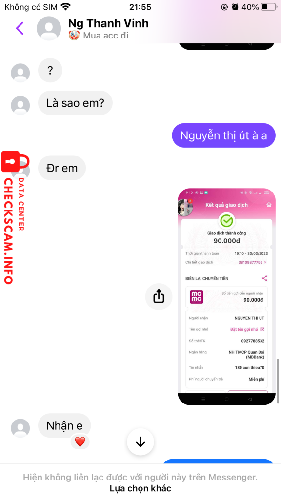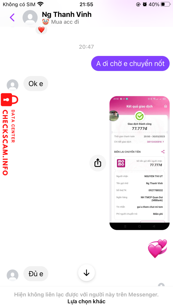 Scammer Alert: NGUYEN THI UT Reported: November 16, 2024 Scammer Information Full Name: NGUYEN THI UT Phone Number: 0927788532 Payment Gate: MB Bank Payment Account: 0927788532 Category: Marketplace scams Source: Checkscam Evidence Files Report Description Bán acc Free fire lừa 257.000 Comments Your comment Add Comment No comments yet. Be the first to share your experience with this scammer.