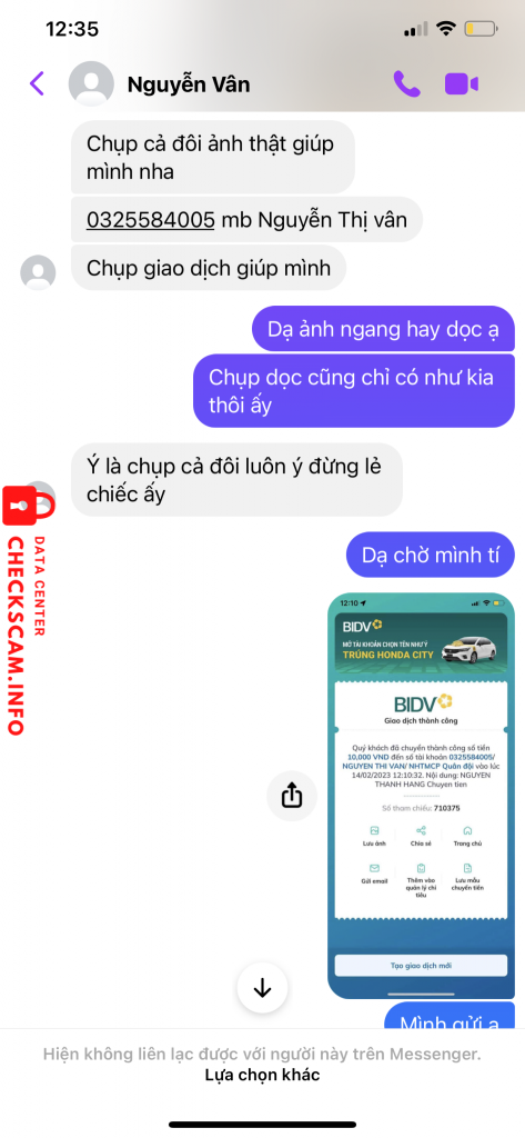 Scammer Alert: Nguyễn Thị Vân Reported: November 16, 2024 Scammer Information Full Name: Nguyễn Thị Vân Phone Number: 0325584005 Payment Gate: MB Payment Account: 0325584005 Category: Marketplace scams Source: Checkscam Evidence Files Report Description Pass đồ hộ nhận tiền xong chặn Comments Your comment Add Comment No comments yet. Be the first to share your experience with this scammer.