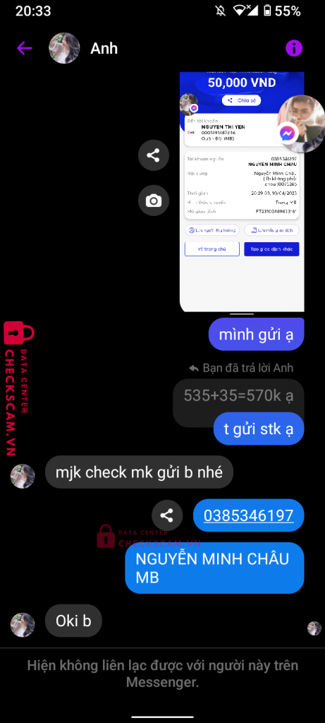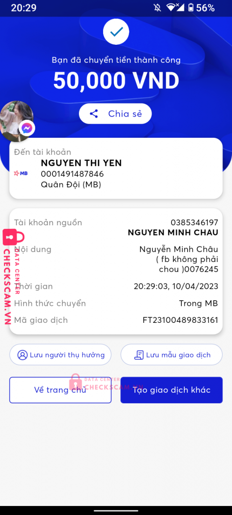 Scammer Alert: NGUYEN THI YEN Reported: November 16, 2024 Scammer Information Full Name: NGUYEN THI YEN Payment Gate: MB Payment Account: 0001491487846 Category: Marketplace scams Source: Checkscam Evidence Files Report Description lừa đảo Comments Your comment Add Comment No comments yet. Be the first to share your experience with this scammer.