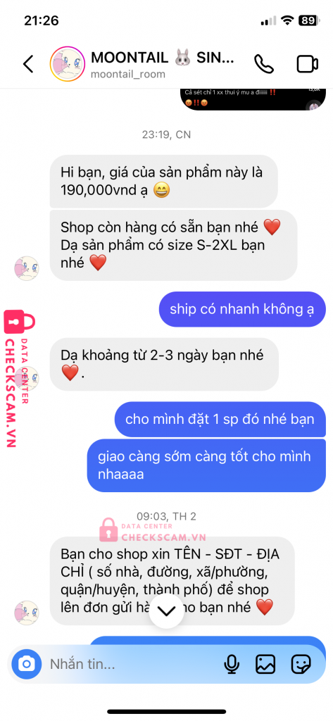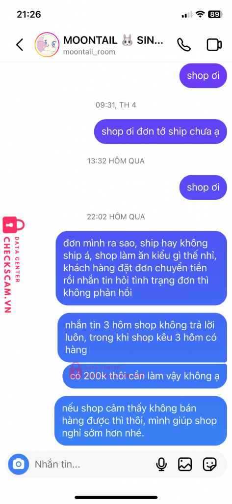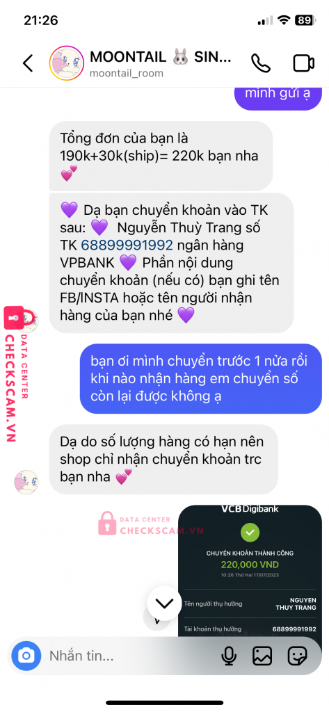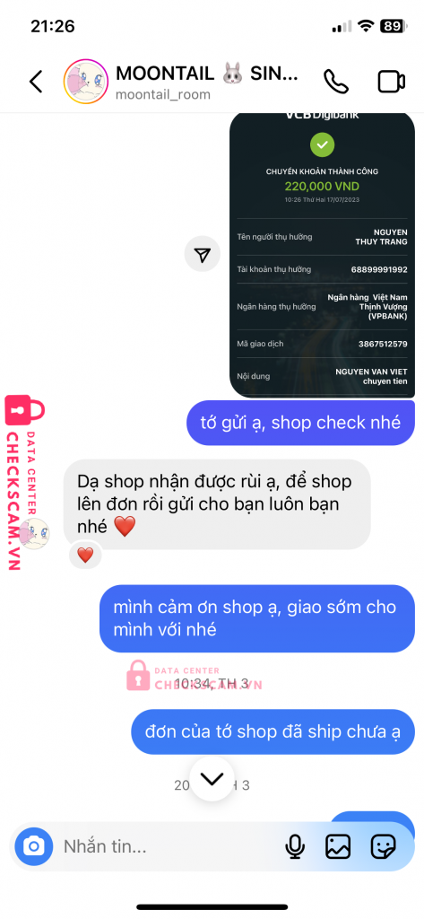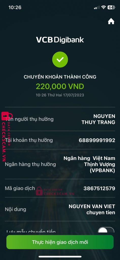 Scammer Alert: Nguyễn Thuỳ Trang Reported: November 16, 2024 Scammer Information Full Name: Nguyễn Thuỳ Trang Payment Gate: VPBANK Payment Account: 68899991992 Category: Marketplace scams Source: Checkscam Evidence Files Report Description mình mua hàng shop này, sau khi chuyển tiền thì không ship hàng và không trả lời tin nhắn, mọi người nên né ra nhé. Comments Your comment Add Comment No comments yet. Be the first to share your experience with this scammer.
