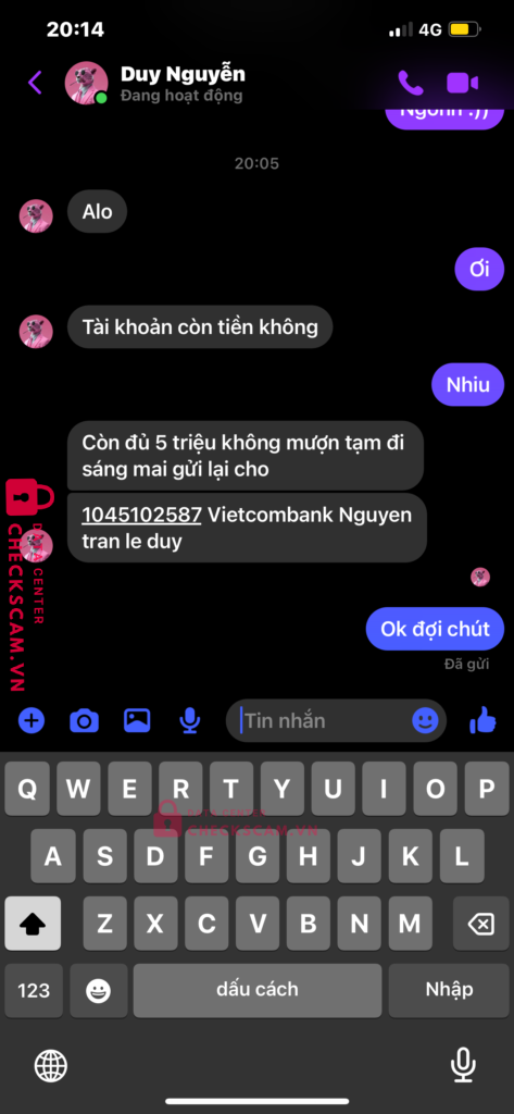 Scammer Alert: Nguyen Tran Le Duy Reported: November 16, 2024 Scammer Information Full Name: Nguyen Tran Le Duy Payment Gate: Vietcombank Payment Account: 1045102587 Category: Marketplace scams Source: Checkscam Evidence Files Report Description Hack fb người nhà tôi, lừa đảo chuyển khoản. Tôi chưa ck nhưng đã kiểm tra lại với người nhà. Comments Your comment Add Comment No comments yet. Be the first to share your experience with this scammer.