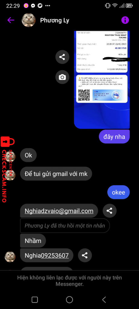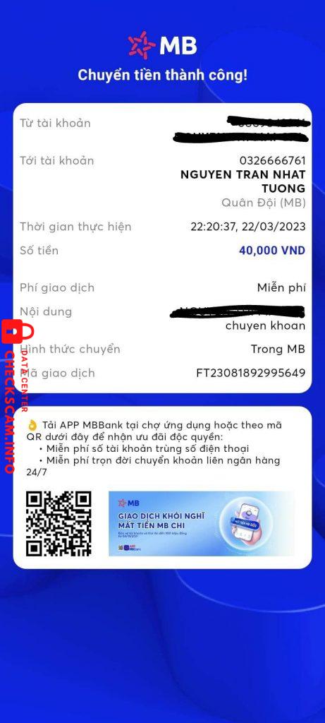 Scammer Alert: NGUYEN TRAN NHAT TUONG Reported: November 16, 2024 Scammer Information Full Name: NGUYEN TRAN NHAT TUONG Payment Gate: MBBANK Payment Account: 0326666761 Category: Marketplace scams Source: Checkscam Evidence Files Report Description lừa chuyển khoản tiền hàng rồi block. Comments Your comment Add Comment No comments yet. Be the first to share your experience with this scammer.