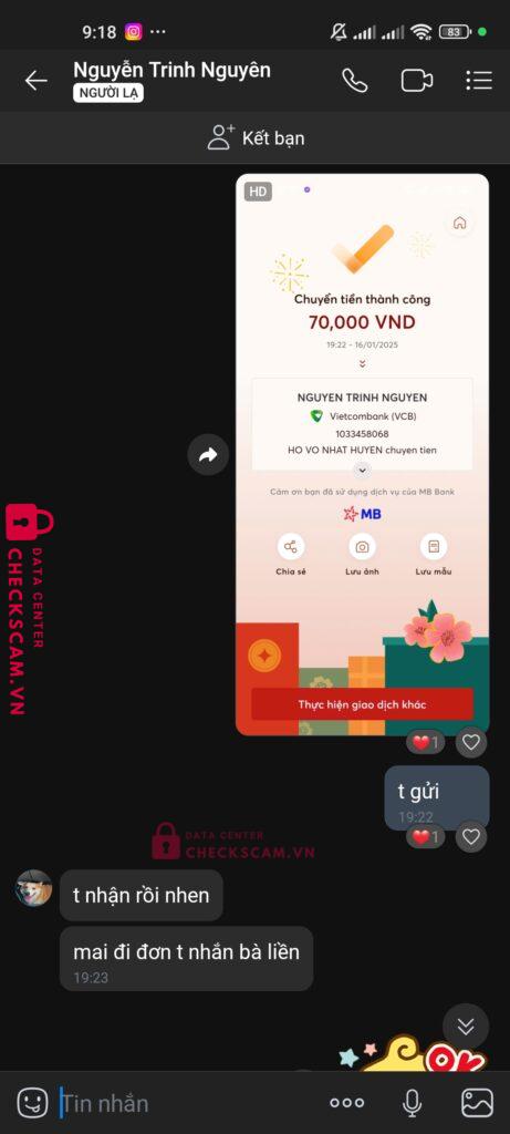 Scammer Alert: NGUYEN TRINH NGUYEN Reported: March 7, 2025 Scammer Information Full Name: NGUYEN TRINH NGUYEN Payment Gate: Vietcombank Payment Account: 1033458068 Category: Marketplace scams Source: Checkscam Evidence Files Report Description lừa bán máy dập phồng tóc gali Comments Your comment Add Comment No comments yet. Be the first to share your experience with this scammer.