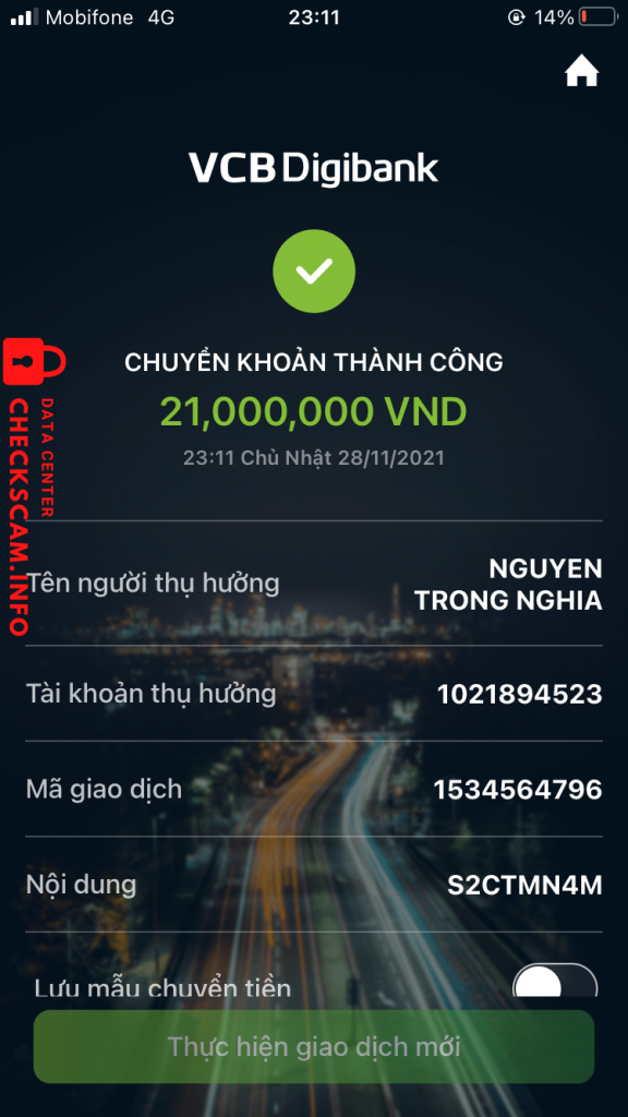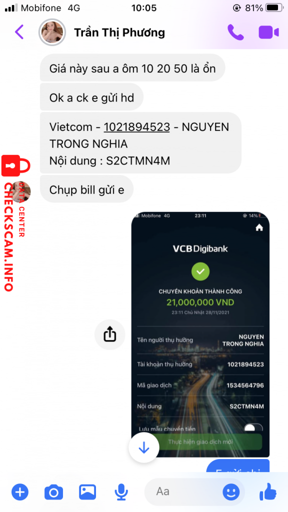 Scammer Alert: Nguyen Trong Nghia Reported: November 16, 2024 Scammer Information Full Name: Nguyen Trong Nghia Payment Gate: Vietcombank Payment Account: 1021894523 Category: Marketplace scams Source: Checkscam Evidence Files Report Description Bị người này lừa đảo 21.000.000 đồng Comments Your comment Add Comment No comments yet. Be the first to share your experience with this scammer.