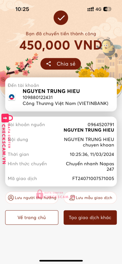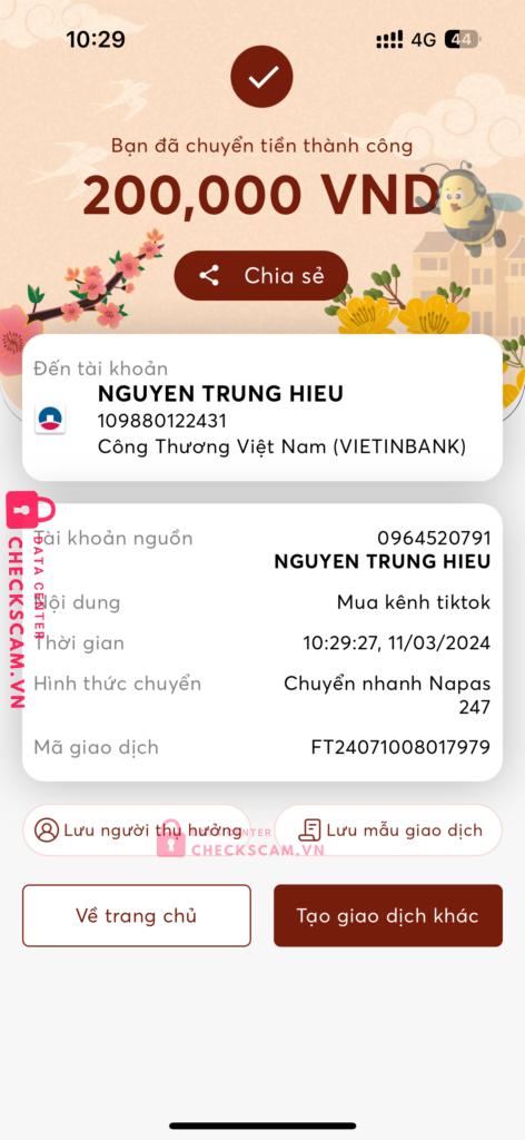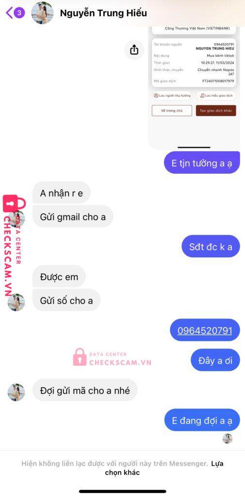 Scammer Alert: NGUYEN TRUNG HIEU Reported: November 16, 2024 Scammer Information Full Name: NGUYEN TRUNG HIEU Payment Gate: Viettinbank Payment Account: 109880122431 Category: Marketplace scams Source: Checkscam Evidence Files Report Description Comments Your comment Add Comment No comments yet. Be the first to share your experience with this scammer.