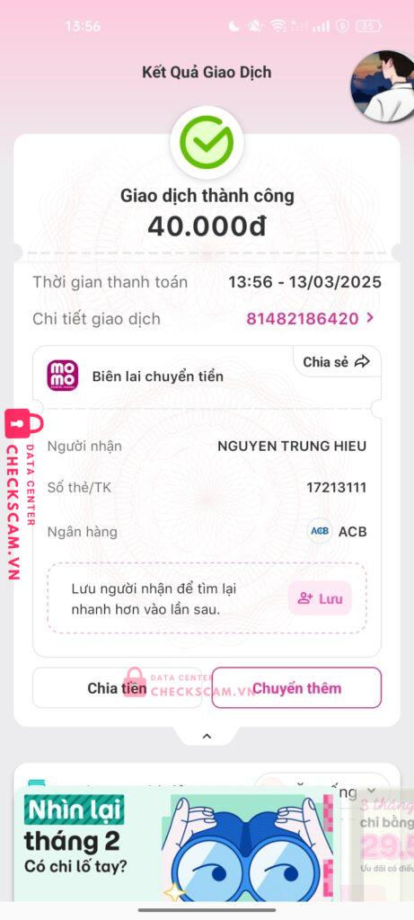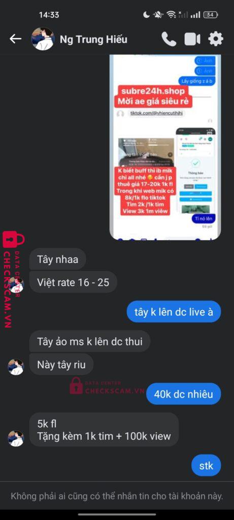 Scammer Alert: Nguyễn Trung Hiếu Reported: May 10, 2025 Scammer Information Full Name: Nguyễn Trung Hiếu Payment Gate: ACB Payment Account: 17213111 Category: Marketplace scams Source: Checkscam Evidence Files Report Description Bạn này nhận buff follow tiktok giá 8k/1k mình có bank 40k thì 30p sau bạn ấy block mình Comments Your comment Add Comment No comments yet. Be the first to share your experience with this scammer.