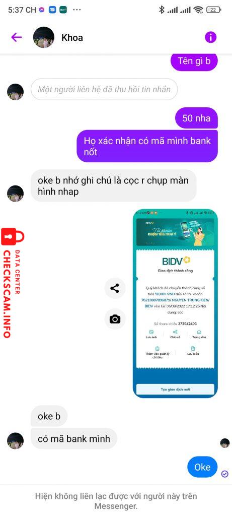 Scammer Alert: Nguyen Trung Kien Reported: November 16, 2024 Scammer Information Full Name: Nguyen Trung Kien Payment Gate: Bidv Payment Account: 76210007896879 Category: Marketplace scams Source: Checkscam Evidence Files Report Description Bán thùng máy tính ryzen 5 2200g giá 1tr4 ở cần thơ Comments Your comment Add Comment No comments yet. Be the first to share your experience with this scammer.
