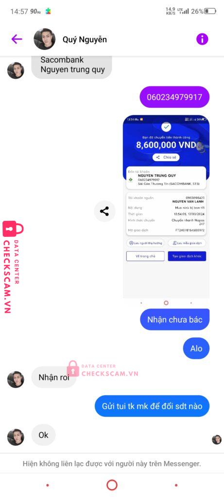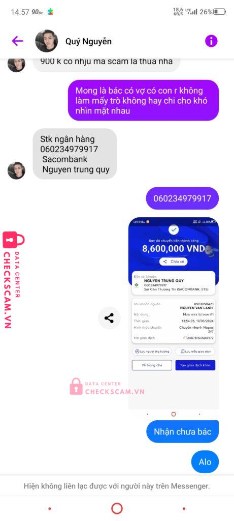Scammer Alert: Nguyen Trung Quy Reported: November 16, 2024 Scammer Information Full Name: Nguyen Trung Quy Payment Gate: Sacombank Payment Account: 060234979917 Category: Marketplace scams Source: Checkscam Evidence Files Report Description Lừa đảo khi mua bán acc Comments Your comment Add Comment No comments yet. Be the first to share your experience with this scammer.