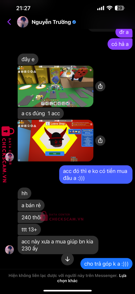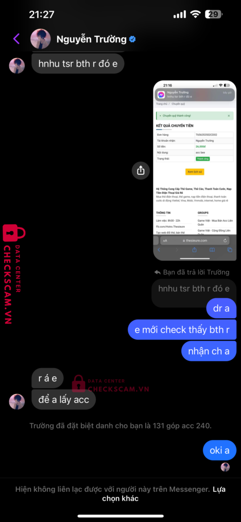 Scammer Alert: Nguyễn Trường Reported: November 16, 2024 Scammer Information Full Name: Nguyễn Trường Payment Gate: Thesieure.com Payment Account: 0844450362 Category: Marketplace scams Source: Checkscam Evidence Files Report Description ae cẩn thần đừng như tôi Comments Your comment Add Comment No comments yet. Be the first to share your experience with this scammer.