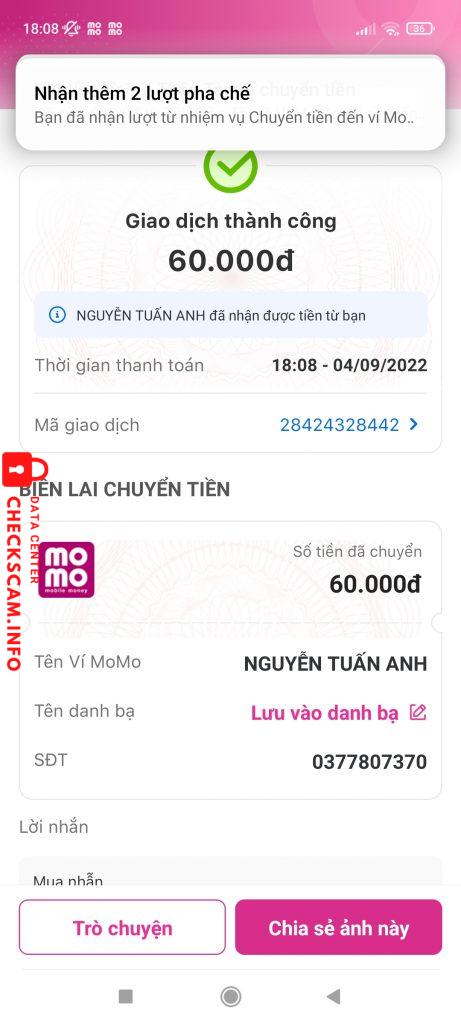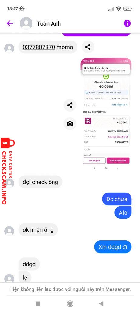 Scammer Alert: Nguyễn Tuấn Anh Reported: November 16, 2024 Scammer Information Full Name: Nguyễn Tuấn Anh Phone Number: 0377807370 Payment Gate: MB Payment Account: 0377807370 Category: Marketplace scams Source: Checkscam Evidence Files Report Description Lừa đảo Comments Your comment Add Comment No comments yet. Be the first to share your experience with this scammer.