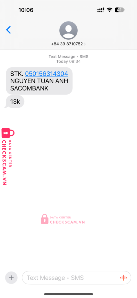 Scammer Alert: Nguyen tuan anh Reported: March 7, 2025 Scammer Information Full Name: Nguyen tuan anh Payment Gate: Sacombank Payment Account: 05015614304 Category: Marketplace scams Source: Checkscam Evidence Files Report Description Lừa đảo chuyển nhầm tiền ship rồi kịch bản sẽ bị trừ 3.5triệu Comments Your comment Add Comment No comments yet. Be the first to share your experience with this scammer.