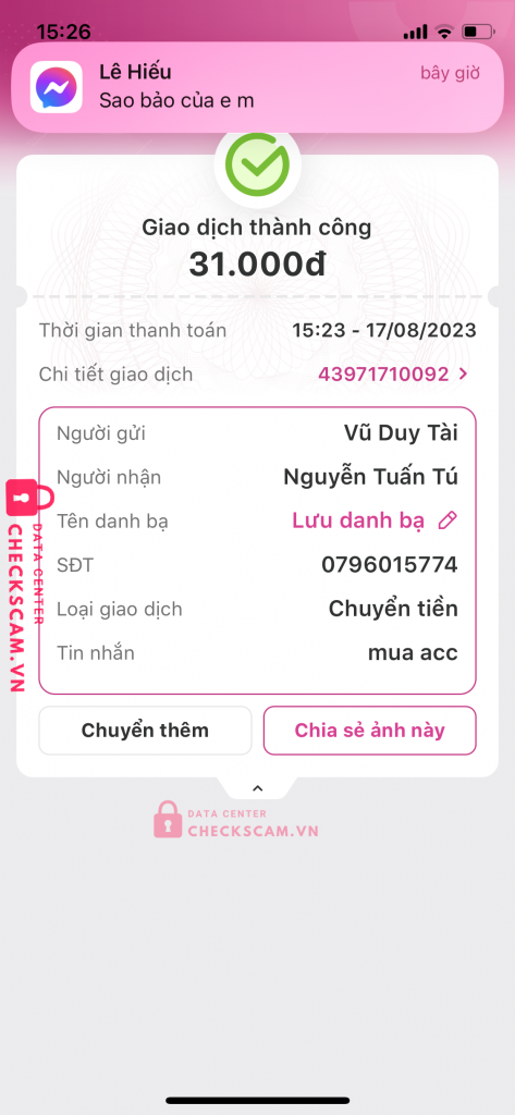 Scammer Alert: Nguyễn tuấn tú Reported: November 16, 2024 Scammer Information Full Name: Nguyễn tuấn tú Phone Number: 0796015774 Payment Gate: Momo Payment Account: 0796015774 Category: Marketplace scams Source: Checkscam Evidence Files Report Description Lừa đảo Comments Your comment Add Comment No comments yet. Be the first to share your experience with this scammer.