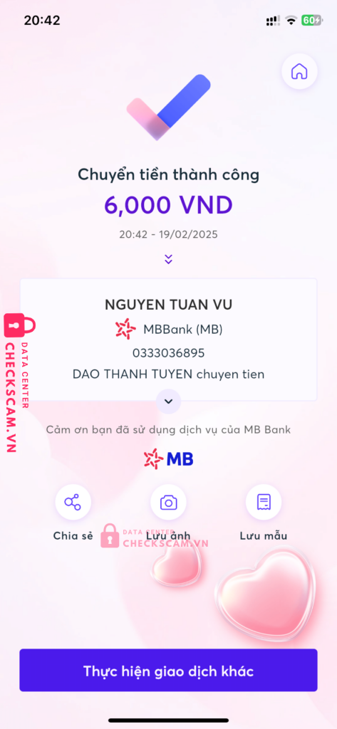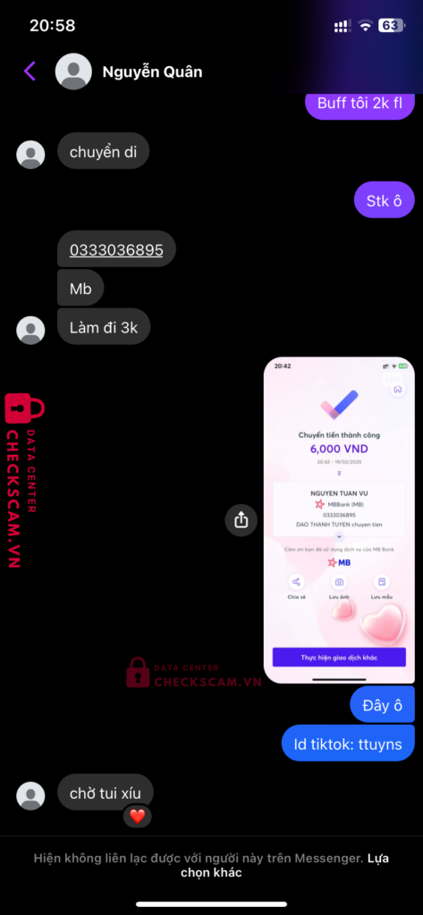 Scammer Alert: Nguyễn Tuấn Vũ Reported: March 7, 2025 Scammer Information Full Name: Nguyễn Tuấn Vũ Payment Gate: MB BANK Payment Account: 0333036895 Category: Marketplace scams Source: Checkscam Evidence Files Report Description Lừa đảo 6000 vnđ để thắp hương cho bố mẹ. Mua fl tiktok mà bú 6k Comments Your comment Add Comment No comments yet. Be the first to share your experience with this scammer.