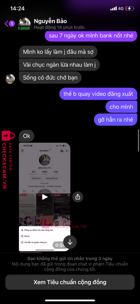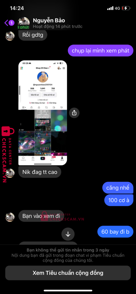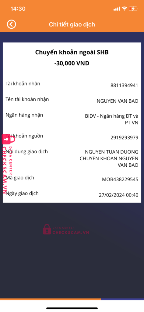 Scammer Alert: NGUYEN VAN BAO Reported: November 16, 2024 Scammer Information Full Name: NGUYEN VAN BAO Payment Gate: BIDV Payment Account: 8811394941 Category: Marketplace scams Source: Checkscam Evidence Files Report Description lừa đảo bán kênh tiktok xong back lại thiệt hại 80k Comments Your comment Add Comment No comments yet. Be the first to share your experience with this scammer.