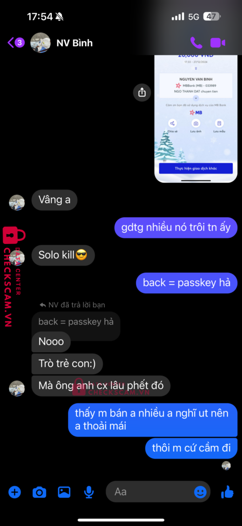 Scammer Alert: NGUYEN VAN BINH Reported: March 7, 2025 Scammer Information Full Name: NGUYEN VAN BINH Payment Gate: MB Bank Payment Account: 033989 Category: Marketplace scams Source: Checkscam Evidence Files Report Description Bán acc tiktok xong back lại Comments Your comment Add Comment No comments yet. Be the first to share your experience with this scammer.