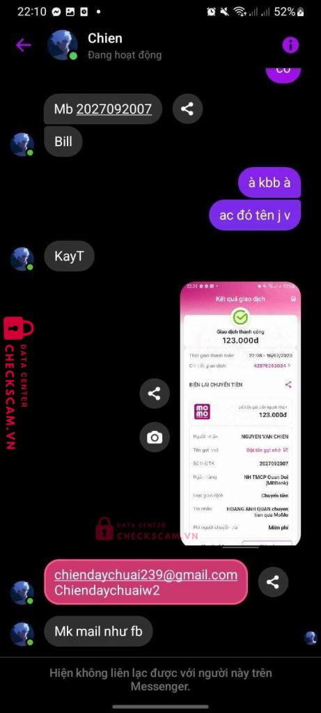 Scammer Alert: Nguyễn Văn Chiến Reported: November 16, 2024 Scammer Information Full Name: Nguyễn Văn Chiến Payment Gate: Mb Bank Payment Account: 2027092007 Category: Marketplace scams Source: Checkscam Evidence Files Report Description Fb Nguyen Van Chien lừa đảo 125k khi mua acc Comments Your comment Add Comment No comments yet. Be the first to share your experience with this scammer.