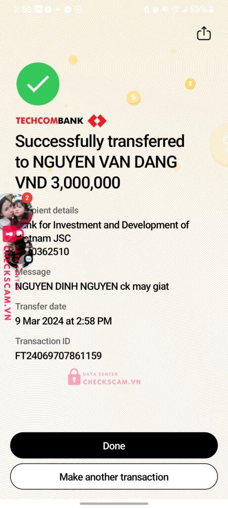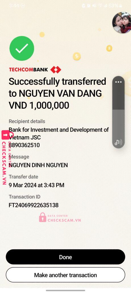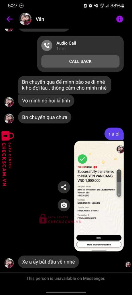 Scammer Alert: Nguyen Van Dang Reported: November 16, 2024 Scammer Information Full Name: Nguyen Van Dang Payment Gate: BIDV Payment Account: 8890362510 Category: Marketplace scams Source: Checkscam Evidence Files Report Description lừa đảo mua đồ gia dụng. 4tr Comments Your comment Add Comment No comments yet. Be the first to share your experience with this scammer.