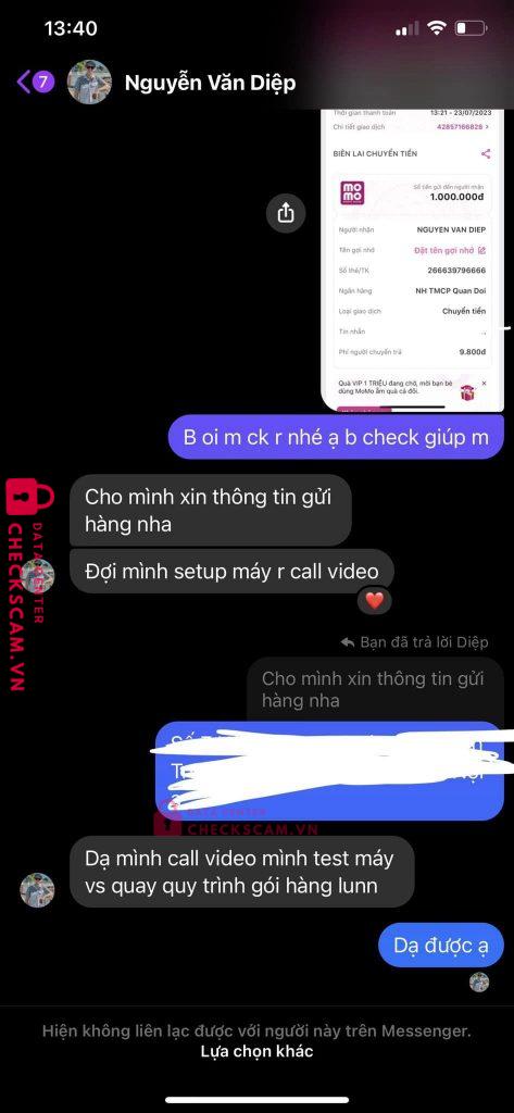 Scammer Alert: Nguyen Van Diep Reported: November 16, 2024 Scammer Information Full Name: Nguyen Van Diep Payment Gate: MB BANK Payment Account: 266639796666 Category: Marketplace scams Source: Checkscam Evidence Files Report Description LỪa đảo tiền bán máy ảnh Comments Your comment Add Comment No comments yet. Be the first to share your experience with this scammer.