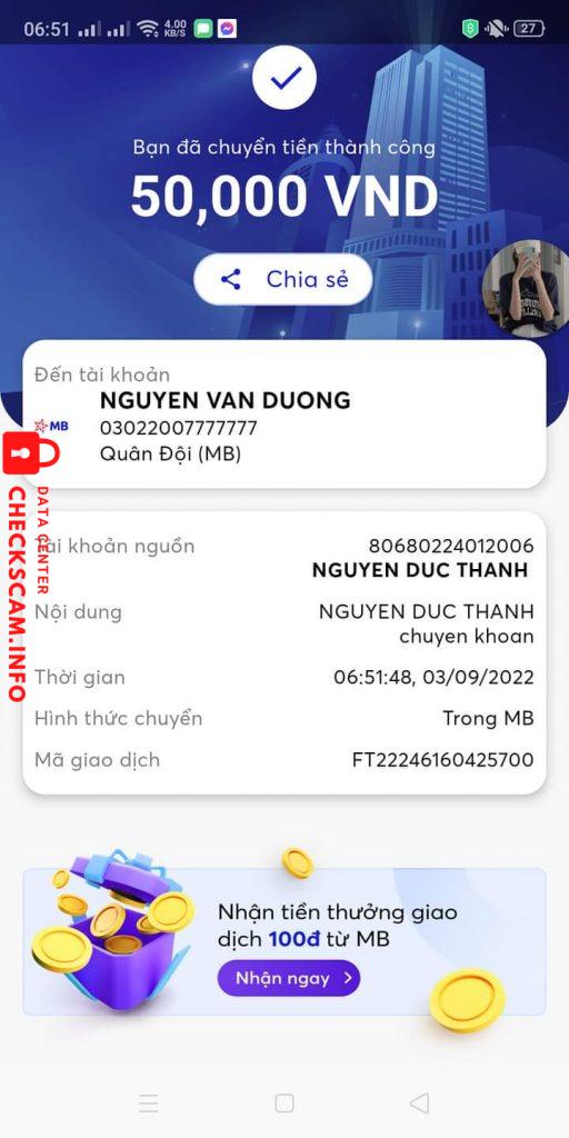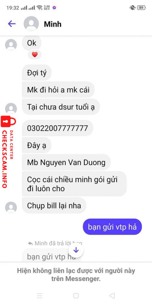 Scammer Alert: NGUYEN VAN DUONG Reported: November 16, 2024 Scammer Information Full Name: NGUYEN VAN DUONG Payment Gate: MB Bank Payment Account: 03022007777777 Category: Marketplace scams Source: Checkscam Evidence Files Report Description scam rất tinh vi a.Bạn đấy k bắt ck full mà bảo cọc tầm 50% .Tầm khoảng 5h sau giao dịch thì bạn đấy sẽ block.Ngoài em ra thì có một bạn nữa a. Comments Your comment Add Comment No comments yet. Be the first to share your experience with this scammer.