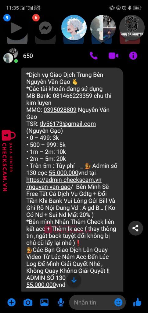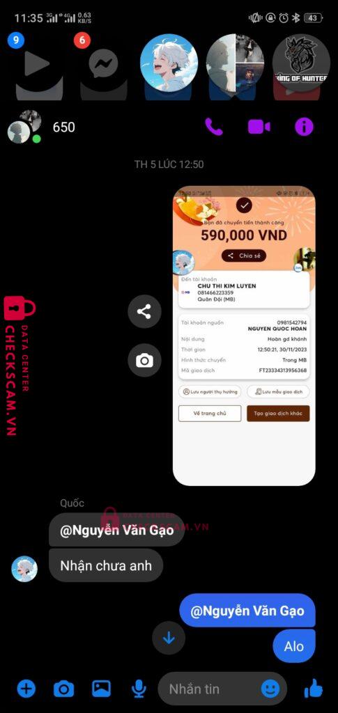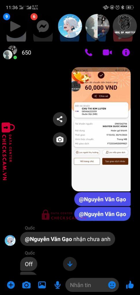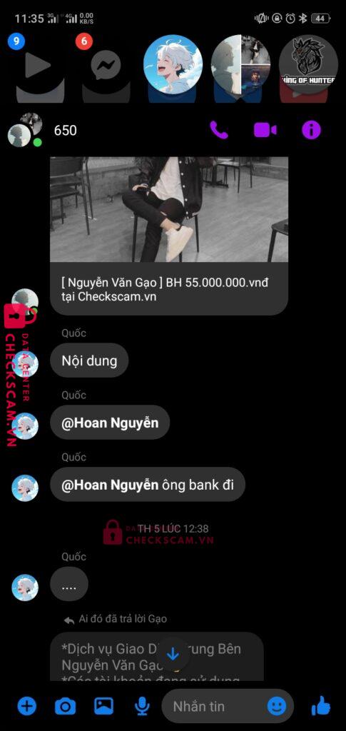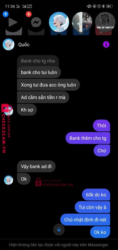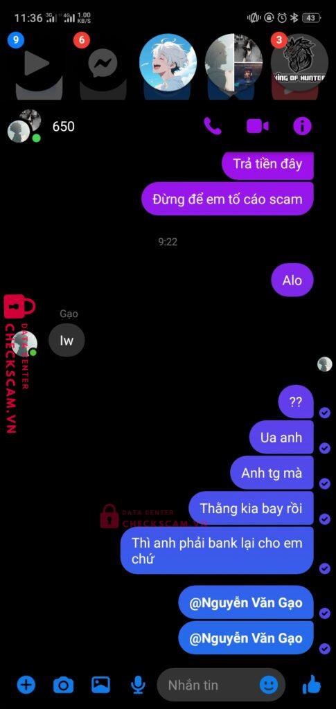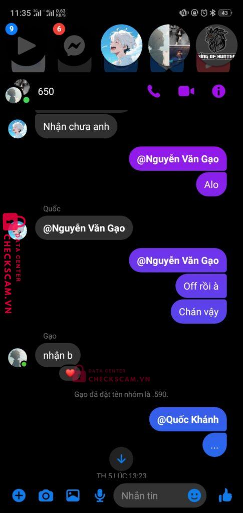 Nguyễn văn gạo làm tg cho gd giữa hoan nguyễn và quốc khánh khi đã chuyển tiền xong khánh đã xóa gạo ra khỏi nhóm rồi rời khỏi box nhưng tôi đã liên hệ dc với gạo và xin lại tiền nhưng gạo đã 2 ngày rồi ko rep vào ko bank lại cho tôi. Xin ad xem xét và giải quyết. Tg làm ăn kiểu này thì chịu