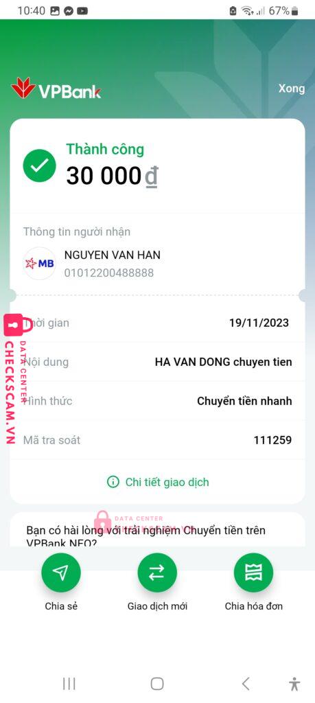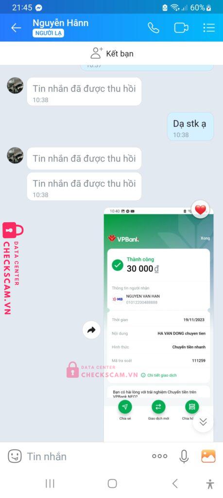 Scammer Alert: NGUYEN VAN HAN Reported: November 16, 2024 Scammer Information Full Name: NGUYEN VAN HAN Payment Gate: MB BANK Payment Account: 01012200488888 Category: Marketplace scams Source: Checkscam Evidence Files Report Description Page lòn 30k cx scam kk Comments Your comment Add Comment No comments yet. Be the first to share your experience with this scammer.