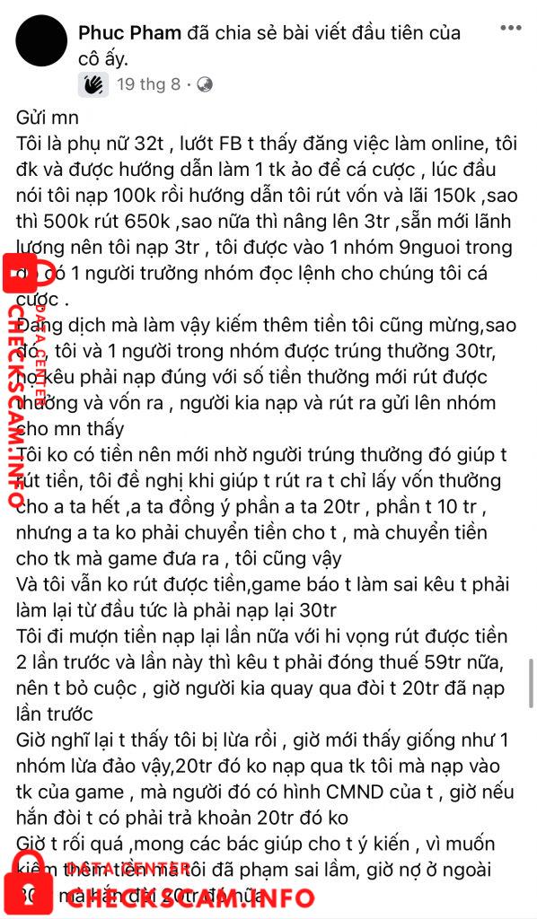 Tôi là phụ nữ 32t , lướt FB t thấy đăng việc làm online, tôi đk và được hướng dẫn làm 1 tk ảo để cá cược , lúc đầu nói tôi nạp 100k rồi hướng dẫn tôi rút vốn và lãi 150k ,sao thì 500k rút 650k ,sao nữa thì nâng lên 3tr ,sẵn mới lãnh lương nên tôi nạp 3tr , tôi được vào 1 nhóm 9nguoi trong đó có 1 người trưởng nhóm đọc lệnh cho chúng tôi cá cược .
