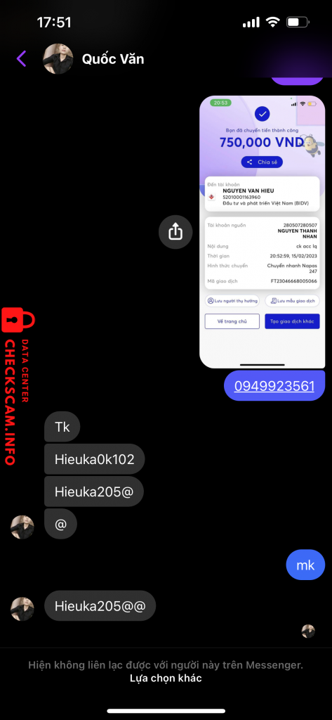 Scammer Alert: NGUYEN VAN HIEU Reported: November 16, 2024 Scammer Information Full Name: NGUYEN VAN HIEU Payment Gate: Mbbank Payment Account: 52010001163960 Category: Marketplace scams Source: Checkscam Evidence Files Report Description nó scam Comments Your comment Add Comment No comments yet. Be the first to share your experience with this scammer.