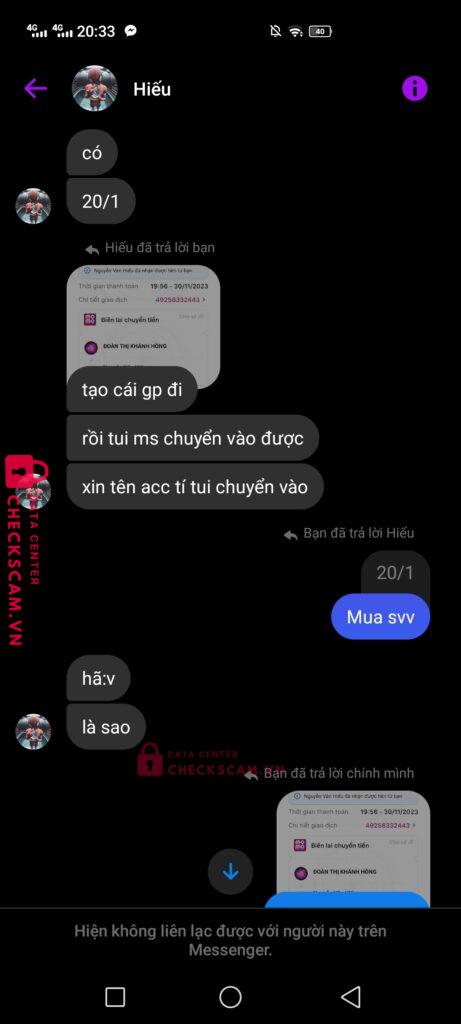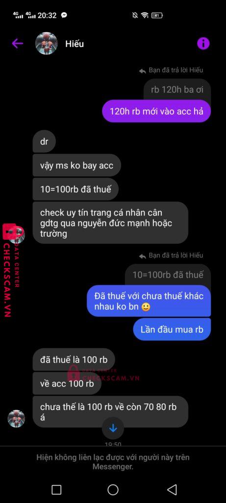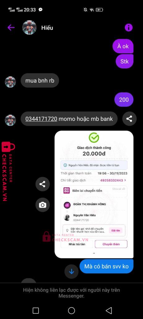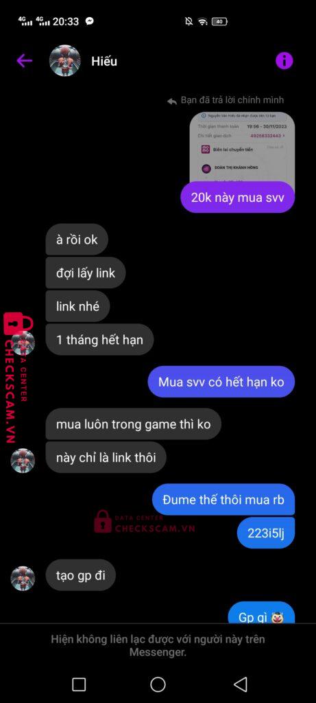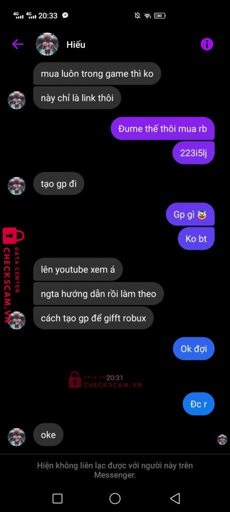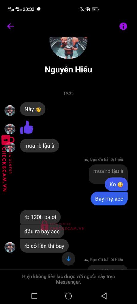 Scammer Alert: Nguyễn Văn Hiếu Reported: November 16, 2024 Scammer Information Full Name: Nguyễn Văn Hiếu Payment Gate: MB Bank Payment Account: 0344171720 Category: Marketplace scams Source: Checkscam Evidence Files Report Description Tôi mua robux của thằng này, khi bank xong thì nó bảo tôi tạo gamepass để nó chuyển gamepass vào acc. Đến khi tôi tạo gamepass xong thì no chặn Comments Your comment Add Comment No comments yet. Be the first to share your experience with this scammer.