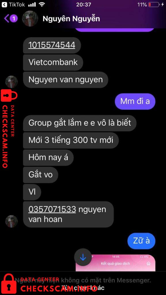 Scammer Alert: Nguyen Van Hoan Reported: November 16, 2024 Scammer Information Full Name: Nguyen Van Hoan Phone Number: 0357071533 Payment Gate: Momo Payment Account: 0357071533 Category: Marketplace scams Source: Checkscam Evidence Files Report Description Lừa đảo nhận thế chấp và nick game tổng 1tr Vnd qua tài khoản ngân hàng 1015574544 Vietcombank và momo 0357071533 Chủ Tài Khoản (Nguyen Van Hoan) Comments Your comment Add Comment No comments yet. Be the first to share your experience with this scammer.