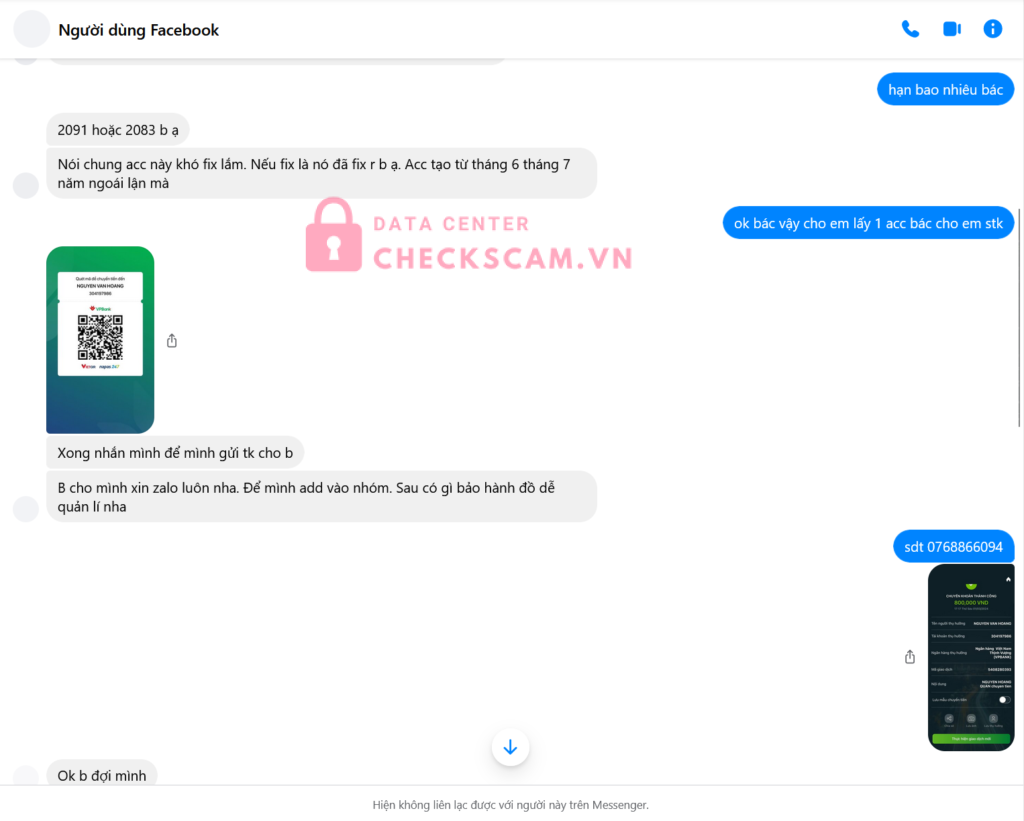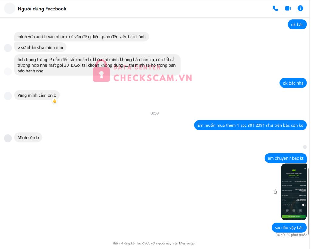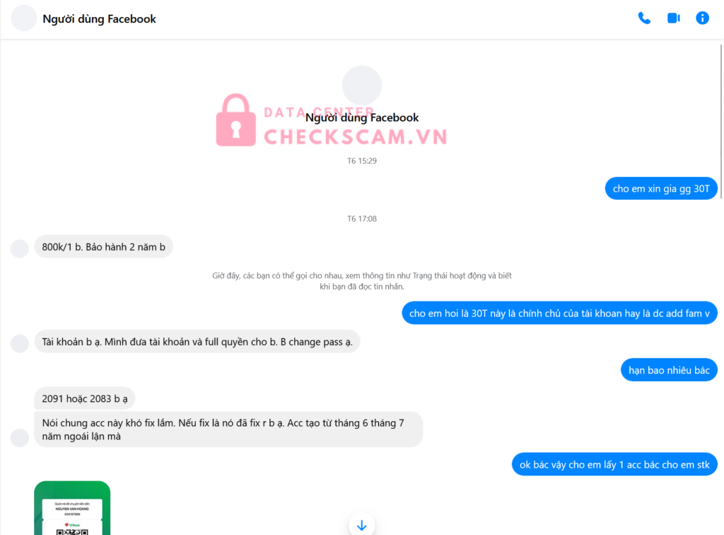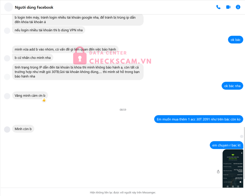 Thứ 6 ngày 1/3/2024 ban đầu em có mua tài khoản google one 30T của nó, lần đầu em chuyển khoản trước nó đưa tài khoản em sau thì mọi thứ diễn ra bình thường em nhận được tài khoản có đủ dung lượng. Tới hôm Chủ Nhật 3/3/2024 em mới nhắn hỏi mua còn tài khoản gmail 30T không nó nói có, thế là em chuyển tiền đợi lâu 1 hồi thì thấy nó khóa hay chặn facebook gì đấy không liên lạc được.