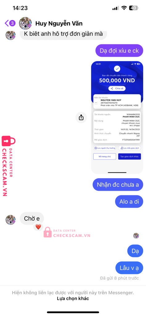 Scammer Alert: NGUYEN VAN HUY Reported: November 16, 2024 Scammer Information Full Name: NGUYEN VAN HUY Payment Gate: Hd bank Payment Account: 281704070010270 Category: Marketplace scams Source: Checkscam Evidence Files Report Description Lừa đảo mua bán acc zing speed Comments Your comment Add Comment No comments yet. Be the first to share your experience with this scammer.