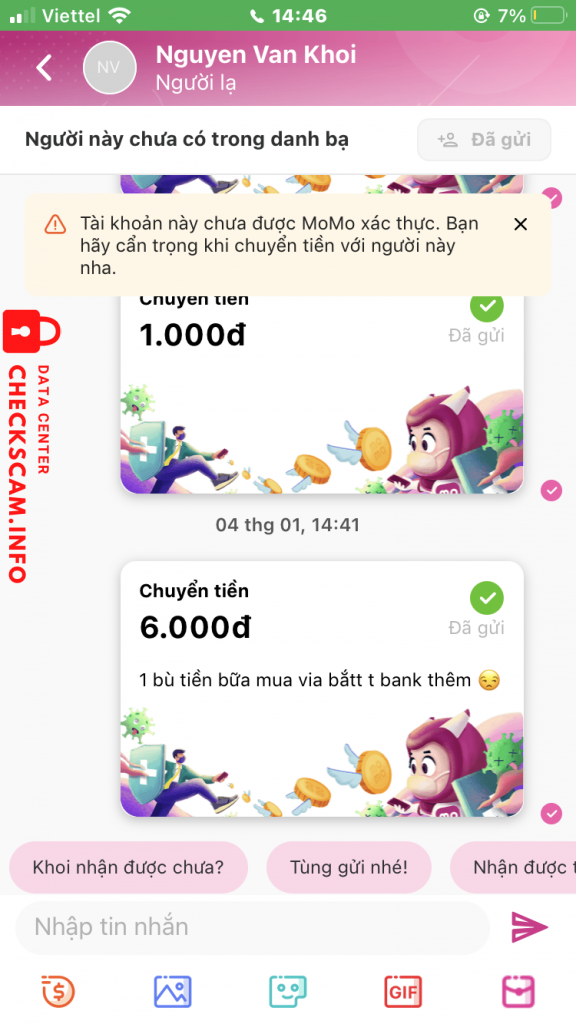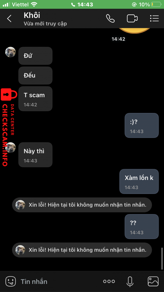Scammer Alert: Nguyễn Văn khôi Reported: November 16, 2024 Scammer Information Full Name: Nguyễn Văn khôi Phone Number: 0377826661 Payment Gate: Momo Payment Account: 0377826661 Category: Marketplace scams Source: Checkscam Evidence Files Report Description Lừa 6k Comments Your comment Add Comment No comments yet. Be the first to share your experience with this scammer.