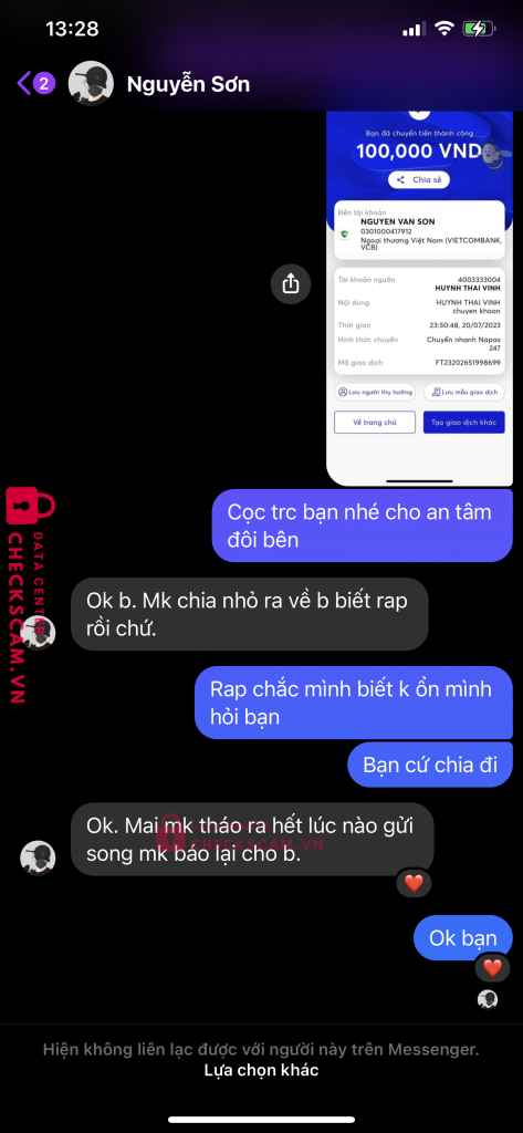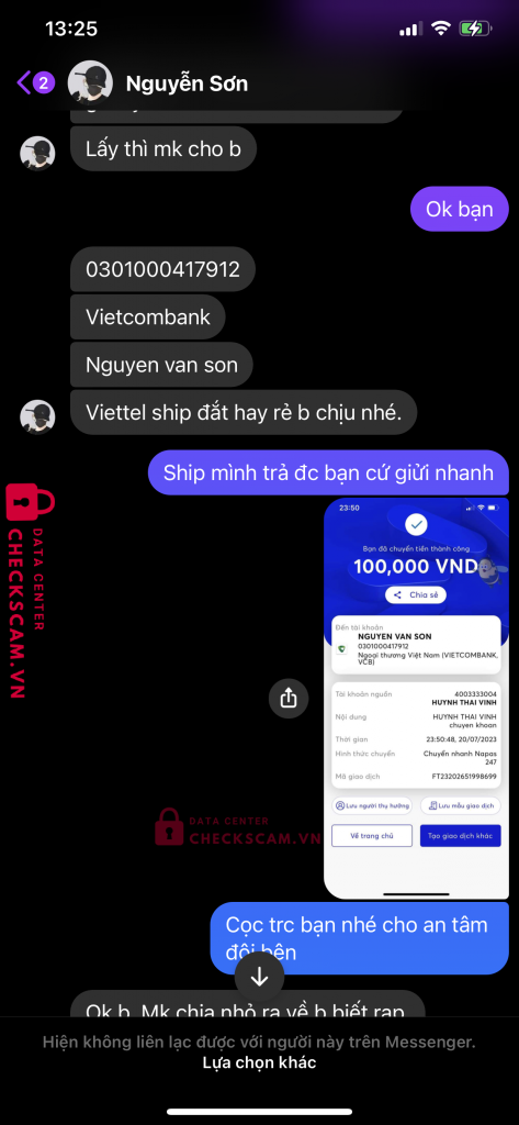 Scammer Alert: Nguyễn vân sơn Reported: November 16, 2024 Scammer Information Full Name: Nguyễn vân sơn Payment Gate: Vietcombank Payment Account: 0301000417912 Category: Marketplace scams Source: Checkscam Evidence Files Report Description Mua hàng bắt cọc rồi đi chặn tài khoản nay tôi giưi stk hắn cho mọi người cảnh giác với kẻ lừa đảo này Comments Your comment Add Comment No comments yet. Be the first to share your experience with this scammer.