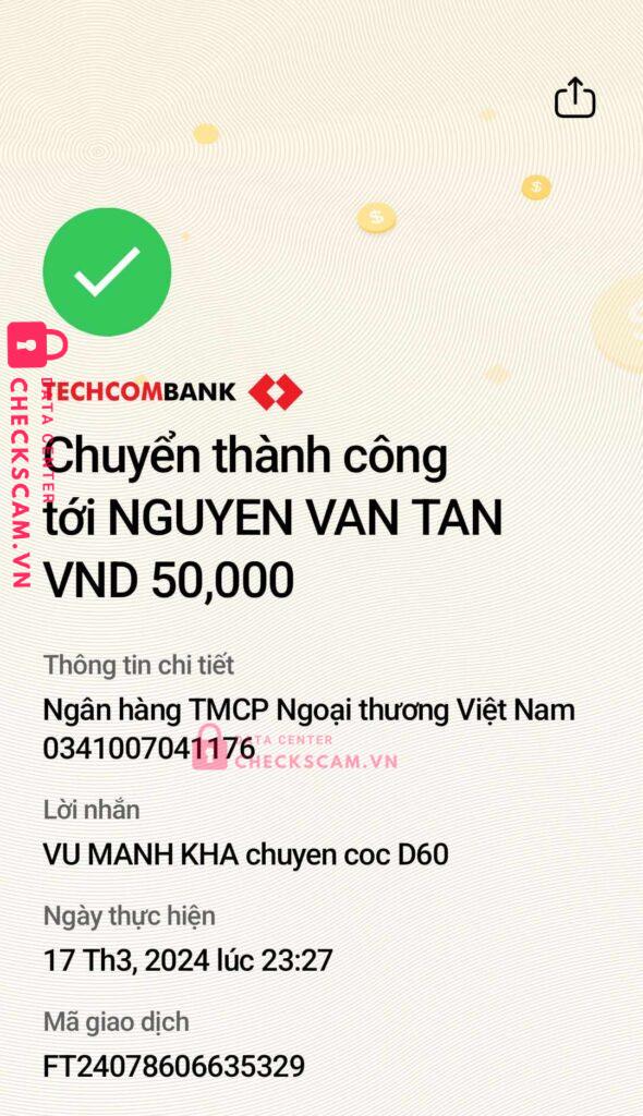 Scammer Alert: Nguyễn Văn Tấn Reported: November 16, 2024 Scammer Information Full Name: Nguyễn Văn Tấn Payment Gate: VCB Payment Account: 0341007041176 Category: Marketplace scams Source: Checkscam Evidence Files Report Description ăn chặn tiền cọc 50k mà ko ship hàng. Comments Your comment Add Comment No comments yet. Be the first to share your experience with this scammer.