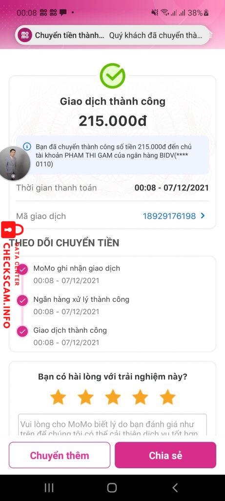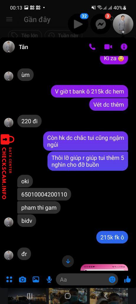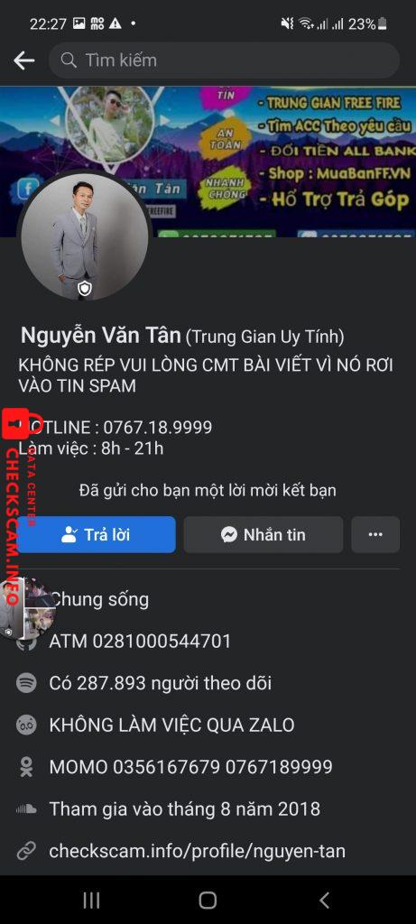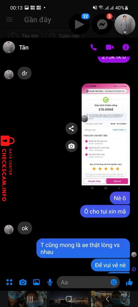 Bạn Nguyễn Văn Tân (Fake) này đã kêu mình chuyển khoản 215k và sau khi chuyển khoản sẽ đưa mình mã facebook để vào game liên quân. Nhưng sau khi chuyển khoảng thì bạn đã chặn mình và trốn. Nhờ bên phía adm coi xem xét giúp mình