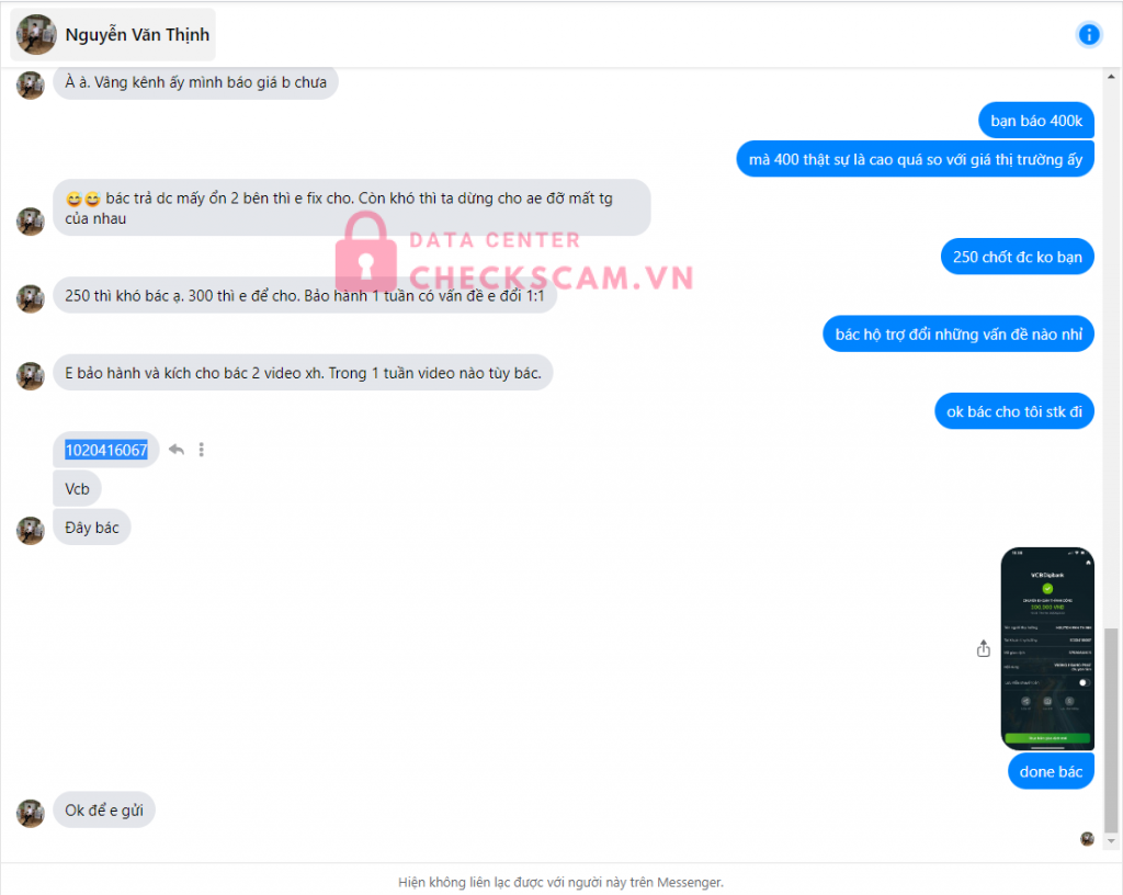 Scammer Alert: Nguyễn Văn Thịnh Reported: November 16, 2024 Scammer Information Full Name: Nguyễn Văn Thịnh Payment Gate: Vietcombank Payment Account: 1020416067 Category: Marketplace scams Source: Checkscam Evidence Files Report Description scam bán nick tiktok Comments Your comment Add Comment No comments yet. Be the first to share your experience with this scammer.