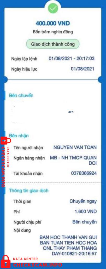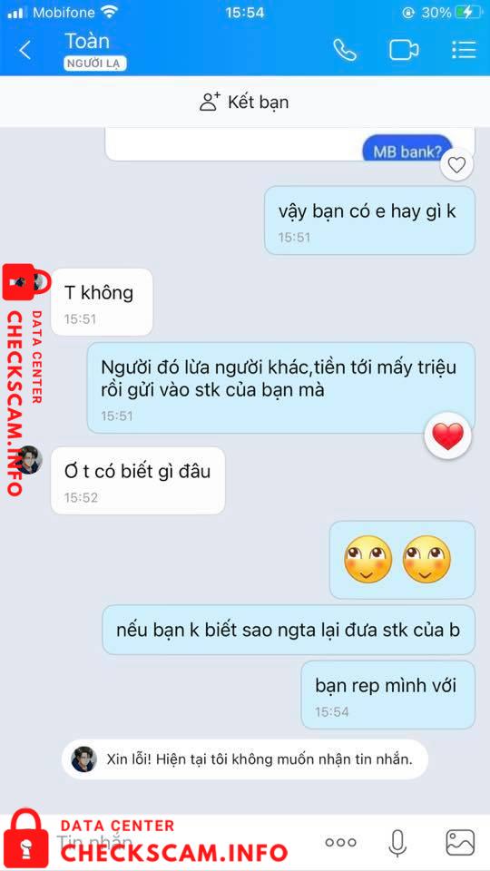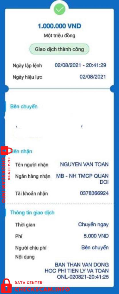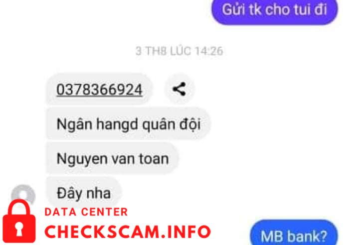Scammer Alert: Nguyen Van Toan Reported: November 16, 2024 Scammer Information Full Name: Nguyen Van Toan Payment Gate: MB - NH TMCP QUAN DOI Payment Account: 0378366924 Category: Marketplace scams Source: Checkscam Evidence Files Report Description Comments Your comment Add Comment No comments yet. Be the first to share your experience with this scammer.