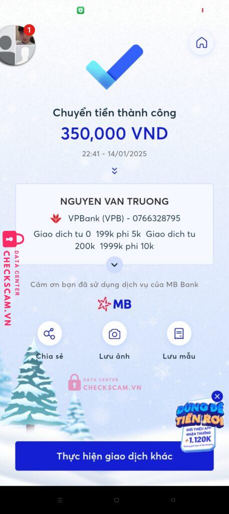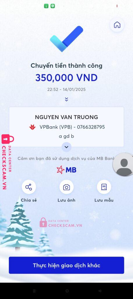 Scammer Alert: NGUYỄN VĂN TRƯỜNG Reported: March 7, 2025 Scammer Information Full Name: NGUYỄN VĂN TRƯỜNG Payment Gate: Vpbank Payment Account: 0766328795 Category: Marketplace scams Source: Checkscam Evidence Files Report Description Chuyển tiền lừa Comments Your comment Add Comment No comments yet. Be the first to share your experience with this scammer.