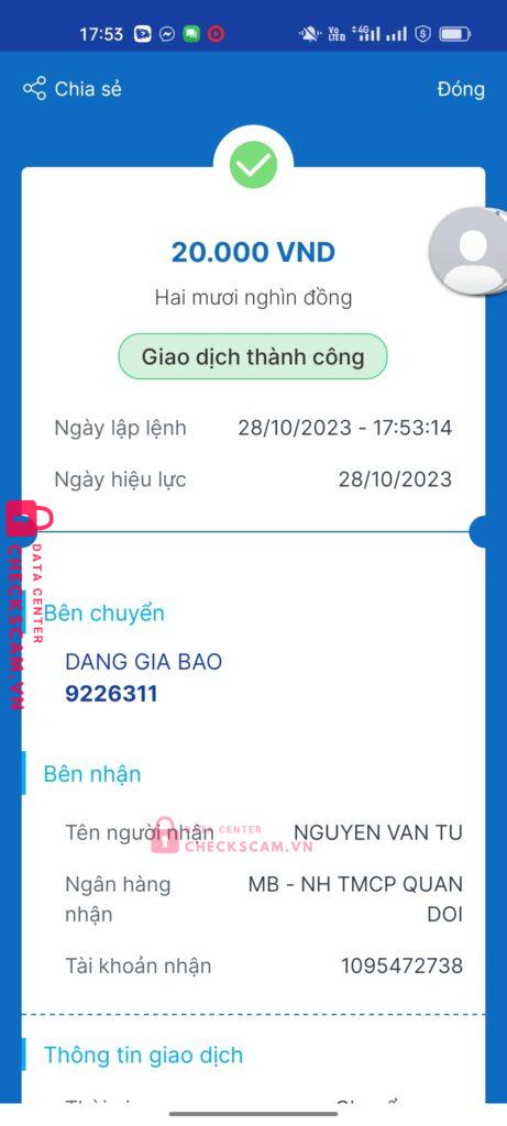 Scammer Alert: NGUYEN VAN TU Reported: November 16, 2024 Scammer Information Full Name: NGUYEN VAN TU Payment Gate: MB bank Payment Account: 1095472738 Category: Marketplace scams Source: Checkscam Evidence Files Report Description Check cọc acc bị lừa đảo đăng cho mn bt Comments Your comment Add Comment No comments yet. Be the first to share your experience with this scammer.