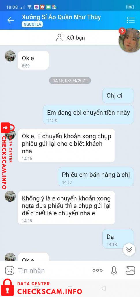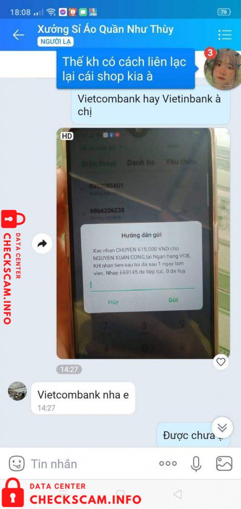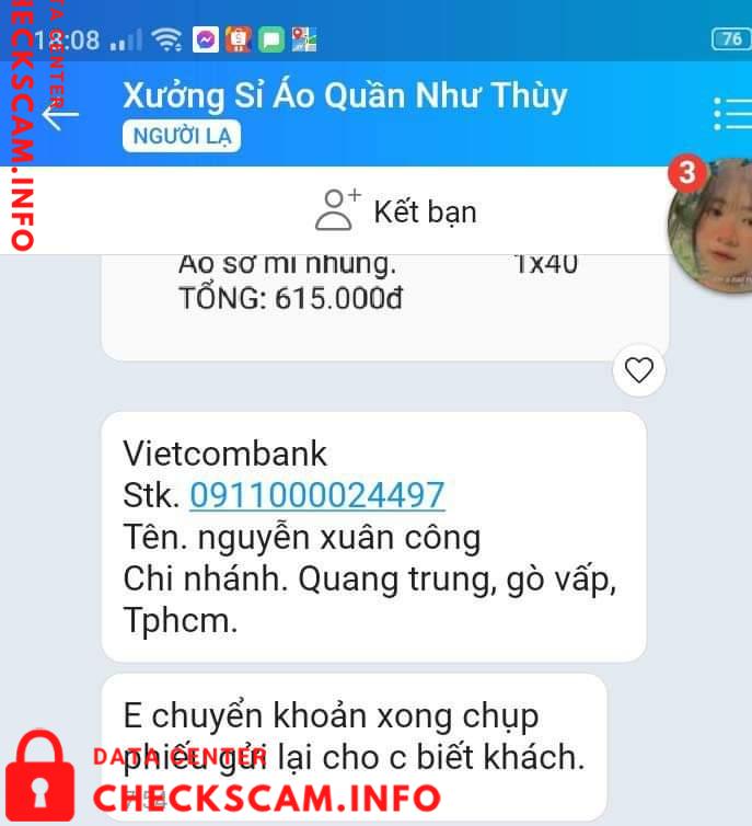 Scammer Alert: Nguyen Xuan Cong Reported: November 16, 2024 Scammer Information Full Name: Nguyen Xuan Cong Payment Gate: Vietcombank Payment Account: 0911000024497 Category: Marketplace scams Source: Checkscam Evidence Files Report Description Em bị mất 615k bức xúc quá mn ạ Làm ăn như vậy đấy Mọi ng cẩn thận shop này nha:)) Comments Your comment Add Comment No comments yet. Be the first to share your experience with this scammer.