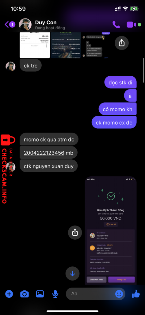Scammer Alert: Nguyen Xuan Duy Reported: November 16, 2024 Scammer Information Full Name: Nguyen Xuan Duy Payment Gate: Mb Bank Payment Account: 2004222123456 Category: Marketplace scams Source: Checkscam Evidence Files Report Description Scam mua Quantimult X và có rất nhiều người nói scam Comments Your comment Add Comment No comments yet. Be the first to share your experience with this scammer.